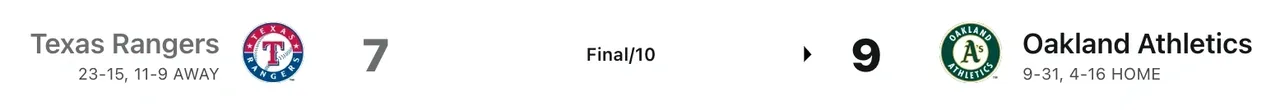 Brent Rooker was the star of this game after hitting a game-winning three-run homer in the 10th inning, helping the Oakland Athletics snap their five-game losing streak with a 9-7 victory over our Texas Rangers. Esteury Ruiz had a strong performance with a home run and four RBIs for the A’s. Kevin Smith and Carlos Pérez also homered for Oakland. Adolis GarcÃa and Marcus Semien provided key hits for the Rangers in the 10th inning, giving us a two-run lead, but the A’s rallied back for the win. Robbie Grossman had a productive game for the Rangers with a home run and a RBI double. The A’s won on a walk-off hit for the third time this season. Shintaro Fujinami earned his first career win by retiring two batters in relief. MartÃn Peréz and Ken Waldichuk had rough performances as starting pitchers for their respective teams.